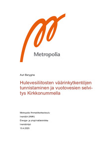 Tämän opinnäytetyön tavoitteena oli selvittää, mitkä menetelmät voivat olla tehokkaita virheellisesti jätevesiviemäriin liitettyjen hulevesiliitosten tunnistamisessa. Työ toteutettiin yhteistyössä Kirkkonummen Veden kanssa, ja tutkimusalueena oli Kaksosvuorentien alue Kirkkonummella. Opinnäytetyön teoriaosuudessa käsitellään vuotovesien päätymistä viemäriverkostoon ja niiden vaikutuksia sekä tarkastellaan hulevettä ja hulevesijärjestelmiä. Käytännön osuudessa tutkittiin kolmea menetelmää virheellisten liitosten tunnistamiseksi. Lopuksi analysoitiin ja arvioitiin saatujen tutkimustulosten luotettavuutta ja soveltuvuutta ongelman ratkaisuun.
