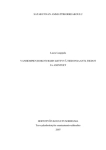 Tutkimuksen tarkoituksena oli selvittää, mistä tai keneltä vanhemmat ovat saaneet rokotuksiin liittyvät tietoa, millaista rokotuksiin liittyvää tietoa he ovat saaneet lastenneuvolasta, mitä vanhemmat tietävät lastensa rokotuksista sekä miten he suhtautuvat lastensa rokottamiseen. Tavoitteena oli tuottaa tietoa, jonka avulla voidaan tarvittaessa kehittää rokotuksiin liittyvää neuvontaa lastenneuvolassa. Tutkimus oli luonteeltaan kvantitatiivinen ja tutkimuksen aineisto kerättiin kyselylomakkeilla. Kyselylomake sisälsi suljettuja, avoimia ja puoliavoimia kysymyksiä. Tutkimuksen kohdejoukkona olivat Rauman kansanterveystyön kuntayhtymän lastenneuvoloissa asioivat vanhemmat (N=124), joiden lapsi oli syntynyt vuonna 2005 tai sen jälkeen. Kyselyyn vastasi 69 vanhempaa ja vastausprosentti oli 56. Tulokset analysoitiin tilastollisesti ja esitettiin frekvensseinä ja prosentteina sekä havainnollistettiin taulukkoina ja kuvioina. Avointen kysymysten vastausvaihtoehdot kirjattiin ylös, niistä laskettiin frekvenssit ja samaa tarkoittavat vastaukset yhdistettiin. Osa vastauksista on havainnollistettu suorina lainauksina.Tulosten mukaan vanhemmat olivat saaneet eniten tietoa rokotuksista lastenneuvolan terveydenhoitajalta. Muita tietolähteitä olivat äitiysneuvolan terveydenhoitaja, ystävät, sukulaiset ja lehtiartikkelit. Vanhemmat olivat saaneet lastenneuvolasta tietoa rokotusaikataulusta, rokotusohjelman antamasta tautisuojasta sekä rokottamisen mahdollisista sivu- ja haittavaikutuksista. Sen sijaan lastenneuvolassa oli annettu vähän tietoa rokottamatta jättämisen seurauksista ja rokkoaineen sisällöstä, ja rokotusohjelman vapaaehtoisuudesta oli kerrottu vain puolelle vastanneista. Vanhempien rokotuksiin liittyvät tiedot olivat tietotestin tulosten mukaan valtaosin hyviä tai kiitettäviä, ja etenkin rokotusten jälkeiset normaalit reaktiot tunnettiin hyvin. Sen sijaan vanhemmat tiesivät melko huonosti rokotusohjelman antaman tautisuojan sekä osan rokottamisen ehdottomista vasta-aiheista. Vanhemmat kaipasivat tietoa rokotusohjelman ulkopuolisista rokotteista, kuten rotavirus-rokotteesta. Vanhempien asenteet rokotuksiin liittyen olivat positiivisia: vanhemmat pitivät rokotuksia tärkeinä, suhtautuivat niihin luottavaisesti ja pitivät niitä turvallisina lapsille. Jatkotutkimusaiheina voisi selvittää esimerkiksi terveydenhoitajien mielipiteitä siitä, mitä asioita he pitävät tärkeinä rokotusneuvonnassa ja verrata näitä tuloksia vanhempien odotuksiin. Lisäksi olisi mielenkiintoista selvittää tarkemmin vanhempien rokotuksiin liittyviä asenteita, etenkin rokotuskielteisyyttä ja sen syitä.