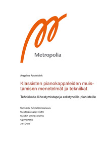 Tässä opinnäytetyössä esitellään menetelmiä musiikkiteosten ulkoa muistamiseen. Työssä tarkastellaan keskeisiä muistin tyyppejä ja analysoidaan uusien teosten oppimisstrategioita. Lisäksi esitellään muistamista tukevia ja haittaavia tekijöitä, keinoja muistamisen vaikeuksien voittamiseksi sekä nykyaikaisia teknologioita, kuten ääni- ja videotallenteita, jotka voivat auttaa musiikillisen materiaalin omaksumisessa.