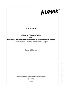 Maharjan, Rupak (2024)This thesis explored the effect of climate crisis in the Himalayas of Nepal and how the adventure businesses should prepare for the future. The thesis was commissioned by Summit Adventure Academy, which is a dynamic adventure ... -