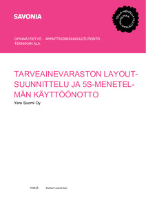 Tämä työ käsittelee tarveainevaraston layout-suunnittelua ja 5S-menetelmän käyttöönottoa Yara Suomi Oy:n Siilinjärven toimipaikalla. Tavoitteena oli luoda varastoon kaksi uutta layout vaihtoehtoa. Uusien layoutien tarkoitus on parantaa varaston toimivuutta ja turvallisuutta erityisesti tilankäytön ja työturvallisuuden osalta. Työ sisältää kaksi erilaista layout-vaihtoehtoa, joista yritys voi valita parhaiten tarpeisiinsa sopivan.