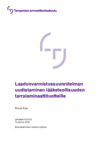 Opinnäytetyössä uudistettiin laadunvarmistussuunnitelma lääketeollisuuden tarralaminaattituotteille tuotantolinja CM 4:n osalta. Työn toimeksiantaja oli UPM Raflatac Oy. Tavoitteena oli saada selkeyttä ja johdonmukaisuutta tuotteiden laadunvarmistussuunnitelmiin, jotka olivat pysyneet ennallaan vuosien ajan. Aluksi tutkittiin ja arvioitiin laadunvarmistusmittausten tarpeellisuutta kyseisen tuoteryhmän tarralaminaattituotteille. Laadunvarmistussuunnitelma päivitettiin tehtyjen havaintojen sekä arvioiden perusteella. Uudistustyötä tehdessä huomioitiin tarralaminaatin toimivuuden näkökulmasta merkittävimmät laadunvarmistusmittaukset: release- ja adheesiomittaukset. Työssä suoritettu arviointi perustui aikaisempaan mittausdataan, mittaustuloksiin ja alan ammattilaisten kokemusperäiseen tietoon. Asiantuntijaryhmän arviot ja mielipiteet optimaalisesta tuotteiden laadunvarmistamisesta koottiin yhteen ja niiden perusteella tehtiin lopulliset päätökset.