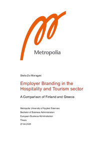 This thesis explores how cultural, economic, and social factors influence Employer Branding (EB) strategies in the hospitality and tourism sectors of Finland and Greece. Both countries face increasing challenges in attracting and retaining skilled personnel, yet their distinct cultural and institutional contexts necessitate individualised EB approaches. By integrating theoretical frameworks from Hofstede, Trompenaars, and Lewis, the study examines national value systems and workplace behaviours that influence EB practices. A qualitative research design was adopted, combining semi-structured interviews with sector professionals and case study analysis from existing literature. The findings highlight Finland’s structured, egalitarian approach to EB, characterised by transparency, employee autonomy, and digital innovation. In contrast, Greece’s EB strategies reflect a relationship based, hierarchical context, where informal networks and seasonal employment dominate. The study reveals that culturally responsive EB strategies grounded in local values and supported by consistent HR practices enhance organisational performance, employee engagement and retention. It concludes with targeted recommendations for both countries, including the need for digitalisation in Greece and continuous employee development in Finland. This research contributes to the growing field of international EB by providing context-specific insights into two economically and culturally distinct EU member states.
