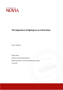 In this thesis, I would like to study about the experience of signing on a new vessel. Since I went to on board training in so many different vessels, I started to have questions about feelings, preparations, experiences and familiarization of the new vessels. Every time when the crew are signing on new vessel, they must study the details of the new vessel. Their feelings might vary regarding different ships. They can be excited, scared, happy or stressed. And with all of these feelings, they can cope with the feelings by accumulating the experiences during the work on vessel. Therefore, the aim of the thesis is to research and study about 7 rating position and 3 officers regarding their feelings and preparations before signing on a new vessel.