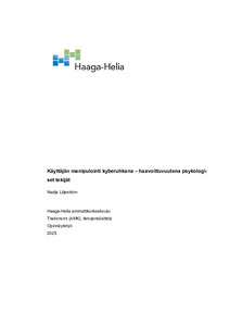 Tämän opinnäytetyön tavoitteena oli selvittää, mitkä yksilön psykologiset piirteet voidaan mieltää haavoittuvuuksiksi käyttäjän manipuloinnin hyökkäyksissä, millaisia psykologisia menetelmiä hyökkääjä hyödyntää, sekä millaisia vaiheita tällainen tarkoin suunniteltu ja kohdennettu hyökkäys sisältää. Työn tarkoituksena oli luoda lukijalle selkeä kuva kyberuhista, joissa olennainen elementti on ihmisen psykologiaan vetoavien menetelmien hyödyntäminen.