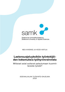 Tässä tutkimuksellisessa opinnäytetyössä käsiteltiin Satakunnan alueella toimivan yksityisen lastensuojeluyksikön työntekijöiden kokemuksia työhyvinvoinnista, jaksamisesta ja palautumisesta. Opinnäytetyön tavoitteena oli selvittää kyselytutkimuksen avulla, millaiseksi työntekijät kokivat oman työhyvinvointinsa ja mitkä tekijät tukivat heidän palautumistaan sekä jaksamistaan työssä. Lisäksi opinnäytetyöllä pyrittiin herättämään ajatuksia yleisesti sosiaalialan työhyvinvoinnista ja siihen vaikuttavista tekijöistä, vaikka tutkimus kohdistettiin vain yhteen lastensuojeluyksikköön.