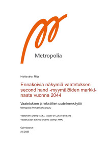 Opinnäytetyön aiheena oli tutkia ennakoinnin kautta vaatetuksen second hand -myymälämarkkinan kehityssuuntia ja mahdollisia tulevaisuuksia pääkaupunkiseudulla. Opinnäytetyöllä ei ole toimeksiantajaa.