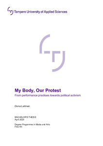 The results of the thesis suggest that the body is something that unites performance art and political activism together. By utilising the body as stage for different power structures, many different cultural and societal discourses can be criticized. From the author’s artistic project rose the idea of ideology of wage labour that could be examined closer in further research. Collective action can be used to challenge ideological practices and performance art can be seen as a form of collective action. This could help with, for example, with the ideology critique of labour in the future.