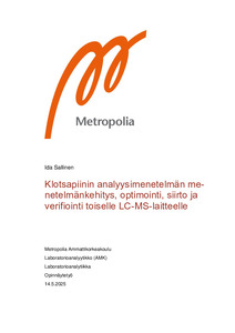 Työn tavoitteena oli siirtää ja verifioida klotsapiinin analyysimenetelmä toisen laitevalmistajan laitteelle ja tarkistaa, että verifioitavan laitteen tarkkuus, toistettavuus ja oikeellisuus ovat samalla tasolla käytössä olevan laitteen kanssa. Samalla menetelmää kehitettiin. Analysoinnissa käytetään ESI-LC-MS/MS- ja dynamic MRM -tekniikkaa.