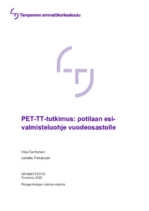 Opinnäytetyön tavoitteena oli lisätä sairaalan vuodeosastojen henkilökunnan tietoisuutta potilaan esivalmisteluista 18F-FDG-radiolääkeellä tehtävää koko- tai ylävartalon PET-TT-tutkimusta varten. Opinnäytetyön tarkoituksena oli laatia visuaalisesti selkeä ja helposti luettava kirjallinen ohje PET-TT-tutkimuksen esivalmisteluista vuodeosastojen hoitohenkilökunnalle. Opinnäytetyön toimeksiantajana eli kohdeorganisaationa oli Pirkanmaan hyvinvointialueen Kliinisen fysiologian ja isotooppilääketieteen yksikkö.
