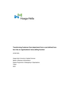 Only little prior research on internal perceptions and the value of customer service departments to organisations exists. The purpose of this thesis was to conduct research on the internal perceptions, potential of shifting these perceptions through organisational changes and creation of further value for the organisation. In addition, this thesis focused on measuring as well as communicating about the added value. The main objective was to provide a report to support the commissioning organisation with information based strategic decision-making.