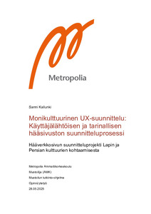 Opinnäytetyössä tarkastellaan käyttäjälähtöistä ja tarinallista UX-suunnittelua monikulttuurisen hääverkkosivuston kontekstissa. Työ toteutettiin yhteistyössä hääparin kanssa todelliseen tarpeeseen: verkkosivun tuli palvella eri kieli- ja kulttuuritaustoista tulevia häävieraita. Sivuston visuaalisessa ja sisällöllisessä teemassa yhdistyvät Lapin ruska ja persialainen juhlaperinne.