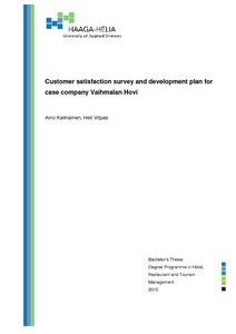 The objective of this Bachelor’s thesis is to research the current state of customer satisfaction in Vaihmalan Hovi and to create a development plan for the future according to the findings. Vaihmalan Hovi is a fairly new private family owned hotel-restaurant situated in Lempäälä, Pirkanmaa. Thesis is commissioned by Vaihmalan Hovi and conducted by the cooperation of two authors to analyse the topic in depth.