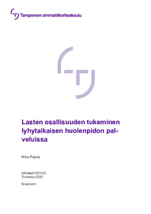 Opinnäytetyö toteutettiin yhteistyössä lasten lyhytaikaisen huolenpidon palveluiden kanssa. Aineistonkeruumenetelmänä käytettiin e-lomakekyselyä, joka kohdistettiin lyhytaikaisen huolenpidon palveluissa työskenteleville työntekijöille. Vastaukset analysoitiin sisällönanalyysin avulla.