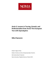 This thesis examines the professional and artistic development of the modern metal band Arctis during their first European tour as the support act for Apocalyptica in the fall of 2024. The aim was to document the band’s growth through real-world touring experience and extract practical insights for future implementation. The project focused on identifying challenges, lessons, and strategies that emerging artists can apply to improve their live performance, logistical planning, and audience engagement.