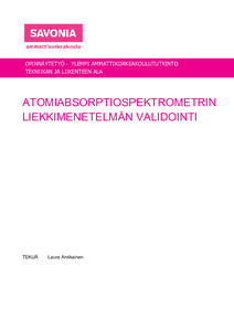 Työn tarkoituksena oli validoida Savonia-ammattikorkeakoulun Vesiturvallisuus tutkimusalan Ympäristötekniikan TKI-yksikköön hankitun uuden atomiabsorptiospektrometrin liekkimenetelmä (FAAS, Flame Atomic Absorption Spectrometry) nestemäisille näytteille tutkimuskäyttöön. Työn tarkoituksena oli myös määrittää valituille alkuaineille määritysrajat ja mittausepävarmuudet sekä luoda ohjeistus uusien alkuaineiden mittausmenetelmien käyttöönottoon tulevia tarpeita varten.