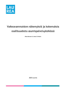 Tämä opinnäytetyö käsittelee vaikeavammaisten henkilöiden osallisuuden näkemyksiä ja kokemuksia asumispalveluyksikössä. Opinnäytetyön tarkoituksena oli selvittää, miten asiakasosallisuus toteutui vaikeavammaisten asumispalveluyksikössä. Tavoitteena oli tuottaa uutta tietoa ja tarjota konkreettisia kehittämisehdotuksia asiakasosallisuuden vahvistamiseksi. Opinnäytetyö toteutettiin yhteistyössä Rinnekodit Oy:n yhden asumispalveluyksikön kanssa, jossa asuu 26 vaikeavammaista henkilöä. Työn tuloksia voidaan hyödyntää yksikön toiminnan kehittämisessä.