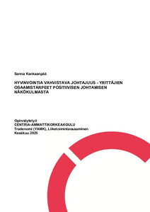 Tämä opinnäytetyö toteutettiin yhteistyössä Keski-Pohjanmaan Yrittäjien kanssa. Lähtökohtana oli ajatus, että hyvinvointi on keskeinen osa nykyaikaista johtamista ja että positiivisella johtamisella voidaan vaikuttaa myönteisesti sekä henkilöstön kokonaisvaltaiseen hyvinvointiin että yrityksen menestykseen. Työssä tarkastellaan yrittäjien osaamistarpeita positiivisen johtamisen näkökulmasta. Työn tavoitteena oli selvittää, millä positiivisen johtamisen osa-alueilla yrittäjät kokevat tarvitsevansa eniten osaamistarvetta, sekä kehittää mittari, jonka avulla näitä tarpeita voidaan jatkossa kartoittaa.