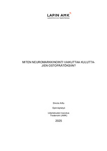 Opinnäytetyö tarkasteli neuromarkkinoinnin vaikutuksia kuluttajien ostopäätöksiin sekä sen eettisiä haasteita. Tutkimuksen tavoitteena oli systematisoida akateemista tietoa neuromarkkinoinnin menetelmistä ja arvioida niiden käytännön sovelluksia sekä eettisiä riskejä. Keskeisiä tutkimuskysymyksiä olivat aistien stimuloinnin tehokkuus, emotionaalisten yhteyksien luominen sekä alan eettiset kysymykset.