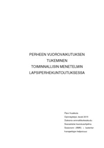 Vuokkola, Päivi. Perheen vuorovaikutuksen tukeminen toiminnallisin menetelmin lapsiperhekuntoutuksessa. Kevät 2015, 72 sivua, 4 liitettä. Diakonia-ammattikorkeakoulu, Sosiaalialan koulutusohjelma, sosionomi (AMK) + lasten-tarhanopettajan kelpoisuus.