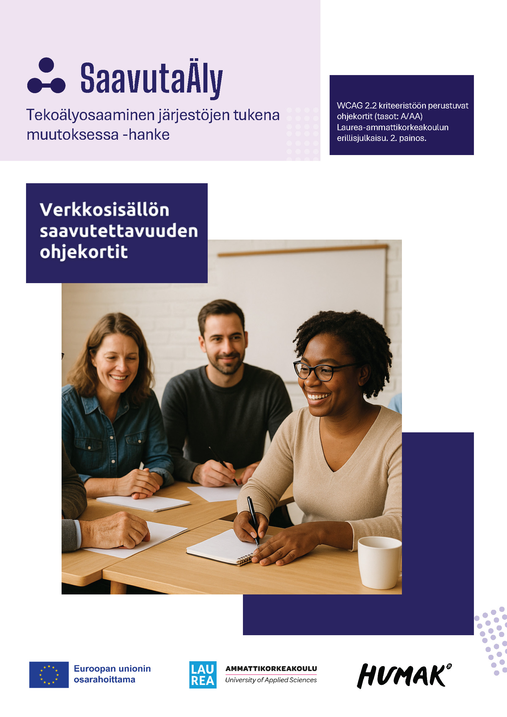 Tämä erillisjulkaisu pohjautuu Disko-hankkeessa (1.9.2021 - 31.8.2023) tehtyyn verkkosisällön saavutettavuuden ohjekortit julkaisuun (Kärpänen, 2023). Tähän julkaisuun on päivitetty uudet WCAG 2.2 vaatimukset.