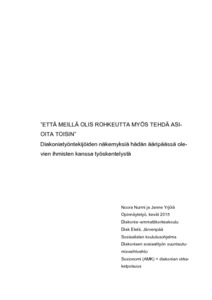 Nurmi, Noora ja Yrjölä, Janne. ”Että meillä olis rohkeutta myös tehdä asioita toisin.” Diakoniatyöntekijöiden näkeyksiä hädän ääripäässä olevien ihmisten kanssa työskentelystä. Kevät 2015 69s., 2 liitettä.