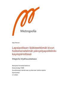 Tämän ylemmän ammattikorkeakoulututkinnon opinnäytetyön tarkoituksena oli kuvailla alle 16-vuotiaille lapsipotilaille soveltuvia lääkkeettömiä kivunhoidon menetelmiä päivystyspoliklinikkaympäristössä sekä kartoittaa lääkkeettömään kivunhoidon menetelmän valintaan ja lapsen kivun hoitoon vaikuttavia tekijöitä. Tavoitteena oli lisätä päivystyspoliklinikoilla työskentelevien sairaanhoitajien tietoutta lapsipotilaille soveltuvista lääkkeettömistä kivunhoidon menetelmistä sekä kivunhoitoon liittyvistä tekijöistä.