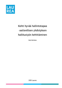 Tämän työn ensisijaisena tavoitteena oli kehittää aatteellisen yhdistyksen hallitustyöskentelyä hyvän hallintotavan mukaisesti. Toisena tavoitteena oli kehittää kohdeyhdistykselle hallitustyön käytännön käsikirjan, joka kokoaa yhteen yhdistyksen hallitustyön keskeiset tehtävät, vastuujaon ja yhdistystoiminnan perusteet. Käsikirja on tämän opinnäytetyön keskeinen tuotos, mutta se jää yhdistyksen sisäiseen käyttöön. Opinnäytetyön liitteeksi toimitetaan käsikirjan sisällysluettelo kuvaamaan käsikirjan rakenteen ja sisällön pääpiirteet.