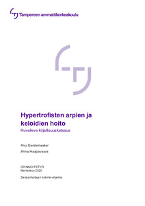 Opinnäytetyö käsittelee hypertrofisten arpien ja keloidien hoitoa terveydenhuollon ammattilaisen näkökulmasta. Opinnäytetyö vastaa kysymykseen siitä, miten aikuispotilaan hypertrofisia arpia ja keloideja hoidetaan. Opinnäytetyössä luodaan katsaus hoitokeinoihin sekä pyritään lisäämään terveydenhuollon ammattilaisten tietoa hypertrofisten arpien ja keloidien hoidosta.