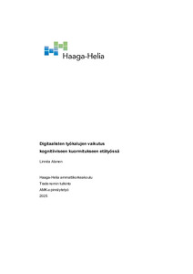 Opinnäytetyössä tarkasteltiin digitaalisten työkalujen vaikutusta kognitiiviseen kuormitukseen etätyössä. Aihe valikoitui koska etätyön yleistyminen COVID-19 pandemian jälkeen muutti pysyvästi työn tekemisen tapoja ja on lisännyt merkittävästi digitaalisten keskeytyksien ja viestinnän määrää. Kognitiivinen kuormitus on ajankohtainen ilmiö vaikuttaen suoraan asiantuntijoiden työhyvinvointiin ja tiedonkäsittelyyn. Tavoitteena oli selvittää, miten digitaaliset työkalut, kuten erilaiset viestintävälineet ja muut keskeytykset kuormittavat työmuistia ja tiedonkäsittelyä sekä millä keinoilla kognitiivista kuormitusta voidaan hallita paremmin etätyössä. Työ rajattiin asiantuntijapalvelualan etätyötehtäviin ja pääasiallinen tarkastelu kohdistui tietotyön henkisiin kuormitustekijöihin.