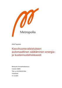 Tämä työ käsittelee kasvihuonevalaistuksen sähkön käyttöä optimoivaa automaattista säätämistä pörssisähkön hinnan mukaan. Työn perustana on tutkimus, jonka mukaan valon intensiteetin vaihtelut eivät haittaa kasveja ja voivat jopa olla hyödyksi. Tämä mahdollistaa valaistuksen säätämistä siten, että sähkön hinnassa säästetään ilman, että se vaikuttaa satotuottoon.