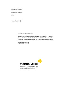 Tutkimme kielitaidon kehitystä kattavalla itsearviointilomakkeella ja tuloksista oli pääteltävissä, että kielitaidon kehitystä tapahtui etenkin suullisessa ja toiminnallisessa kielitaidossa, mutta kirjallisen kielitaidon kehittyminen vaati opiskelijoilta enemmän. Tulokset vastaajien kesken olivat samansuuntaisia muutamaa poikkeusta lukuun ottamatta. Opiskelijat arvioivat itsearviointilomakkeessaan, että koulutus olisi helpottanut heidän sijoittumistaan työelämään. This thesis examines the development of Finnish languages skills among social services students participating in the Maakunta työllistää project during their studies and training. Highly educated immigrants often face the risk of unemployment due to insufficient language proficiency or underutilization of their professional skills.