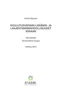Tämän opinnäytetyön tarkoituksena on kehitellä Kymenlaakson ammattikorkeakoulun ja Kiinan Jinhua Polytechnicin välistä koulutusvientitoimintaa. Kyseisen kiinalaisen yhteistyökoulun opettajille on syyskuussa 2014 järjestetty ensimmäinen koulutus Suo-messa. Tämän tutkimuksen tavoitteena on tutkia koulujen välisiä koulutusviennin laa-jentamis- ja lisäämismahdollisuuksia.