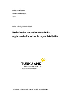 Kotisairaalassa sairaanhoitaja toteuttaa sairaalatasoista hoitoa potilaan kotona. Osittain hoito edellyttää erikoissairaanhoidon osaamista. Laaja-alainen ammatillinen kompetenssi, itsenäinen päätöksentekokyky ja kyky tehdä hoidon tarpeen arviointia on kotisairaalahoidossa olennaista. Tämän opinnäyteyön tehtävä oli luoda kotisairaalaa käsittelevä Thinglinkmuotoinen digitaalinen oppimateriaali Turun Ammattikorkeakoulun sairaanhoitajaopiskelijoille. Opinnäytetyön tavoite on esitellä kotisairaalatoimintaa sairaanhoitajaopiskelijoille ja edistää heidän valmiuksiaan toteuttaa hoitoa eettisesti ja turvallisesti kotisairaalassa. Opinnäytetyö toteutettiin toiminnallisena opinnäytetyönä projektimuodossa. Työn lopputulos on Thinglink -sivuostolle laadittu kotisairaalatoimintaa kuvaava virtuaalinen 360°-oppimisympäristö. Opiskelija liikkuu oppimisympäristössä itsenäisesti ja saavuttaa näin immersiivisen ja ubiikin oppimiskokemuksen. Oppimateriaali koostuu toisiinsa kytkeytyvistä 360°-kotisairaalakuvista. Opiskelijan on mahdollista avata 360°-kuvissa kotisairaalatoiminnasta kertovia tietoikkunoita. Oppimisprosessin tueksi materiaaliin on liitetty tietotesti. Virtuaalisen oppimateriaalin luominen on tekijäänsä opettava prosessi. Esitettävän materiaalin laajuus ja -yksityiskohtaisuus edellyttää harkintaa. Oppimateriaalia on mahdollista kehittää kertomalla laajemmin kotisairaalassa toteutettavista hoidoista, lisäämällä potilasesimerkkejä ja laajentamalla tietotestiä. Virtuaalinen oppimisympäristö yhtäältä tehostaa oppimista, mutta toisaalta vähentää vuorovaikutusta opettajan ja opiskelijan välillä. In a Hospital-at-Home setting the patient is administered hospital-level care within the confines of the patients own home. All care is administerd by a registered nurse. In some cases specialised competence is required. Also ability to make decicions independently and ability to assess the need for care is of essence. The purpose of this thesis was to create a Thinglink learning environment that demonstrates the concept of Hospital-at-Home for registered nurse students. The material is produced for Turku University of Applied Sciences. The objective of this thesis is to improve the competence of a registered nurse to implement care ethically and safely in a Hospital-at-Home envioronment. This prcatice-based thesis was carried out in project form. The outcome of this thesis is a virtual 360۠°-learning envioronmet that illustrates activities and features of a Hospital-at-Home. A student is able to navigate whitin the learning environment independently and obtain an immersive and ubiquitous learning experience. The material consist of interconnected 360° Hospital-at-Home - views. Within these pictures a student can open windows with more detailed information. A knowledge test is integrated to the learning envioronment to support the learning process. Creating a virtual learning envioronment is a process that educates it’s maker. Both the scope and thoroughness of the information presented necessitates consideration. It is possible to further develop the material by broadening both the scope of information presented and the scope of the integrated test. Also presenting more exemplary patients is a possibility. As the virtual learning envioronmet intensifies the learning process it can simultaneously undermine the interaction between a student and a professor.