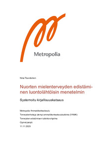 Nuorten mielenterveys on merkittävä kansanterveydellinen haaste maailmanlaajuisesti. Mielenterveyden tukeminen nuoruusiässä onkin ensiarvoisen tärkeää sekä yksilön hyvinvoinnin että yhteiskunnan kestävyyden näkökulmasta. Tämän opinnäytetyön tarkoituksena oli kuvata 12–29-vuotiaiden nuorten mielenterveyden edistämistä luontolähtöisillä menetelmillä. Tavoitteena oli tuottaa näyttöön perustuvaa tietoa mielenterveyden edistämisestä luontolähtöisin menetelmin hyödynnettäväksi nuorten mielenterveystyötä tukevissa organisaatioissa ja hankkeissa.