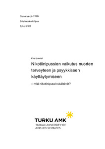 Tutkimustietoa on vielä vähän saatavilla aiheen tuoreuden takia. Tutkimustulokset osoittavat nikotiinipussien käytön riskit sekä niiden aiheuttaman riippuvuuden käyttäjälleen. Jatkotutkimukselle on aihetta, koska nikotiinipussien käytön pidempiaikaisesta haitoista ei ole vielä tietoa. Varhan nikotiinipussien käyttö on lisääntynyt perusopetuksen 8. ja 9. lk. keskuudessa, lukiossa ja ammatillisessa oppilaitoksissa pojilla ja tytöillä vuodesta 2023 vuoteen 2025. Myös ulkomailla nikotiinipussien käyttö on lisääntynyt nuorten keskuudessa. The aim of this thesis is to provide information to Turku University of Applied Sciences, young people and young adults, parents, teachers, and professionals in the field. The thesis was commissioned by the Southwest Finland Cancer Society (LSSY).