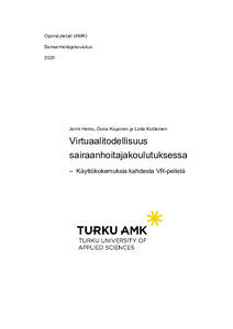 Opinnäytetyön tarkoituksena oli selvittää Turun ammattikorkeakoulun sairaanhoitajaopiskelijoiden (n=86) käyttökokemuksia kahdesta koulutuksen osana hyödynnettävästä virtuaalitodellisuuspohjaisesta pelistä. Tavoitteena oli saada arvokasta tietoa, jonka avulla voitaisiin tukea Turun ammattikorkeakoulun sairaanhoitajakoulutuksen eri opetusmenetelmien laadun kehittämistä. Työn toimeksiantajana toimi Turun ammattikorkeakoulu.