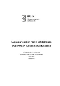 Tämän opinnäytetyö tavoitteena oli selvittää millaisena Uudenmaan kuntien alueidenkäytön ja kaavoituksen suunnittelijat näkevät luontojärjestöjen roolin kaavoitusprosessissa, ja miten ja missä vaiheessa kaavoitusprosessia Uudenmaan kunnat pystyisivät nykyistä tehokkaammin osallistamaan luontojärjestöjä ja hyödyntämään niiden osaamista. Työn tilaaja on Suomen luonnonsuojeluliiton Uudenmaan piiri ry. Piiri seuraa Uudenmaan kaavoitusta ja maankäyttöä, tekee lausuntoja maankäyttösuunnitelmiin ja auttaa paikallisyhdistyksiä heidän omassa vaikuttamistyössään. Lisäksi Uudenmaan piirillä on erilaisia toimintaryhmiä ja luonnonhoitohankkeita.