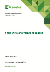 Tulosten perusteella verkkokauppayrittäjyys on monialainen ja jatkuvasti kehittyvä kokonaisuus, joka edellyttää suunnitelmallisuutta, oppimista ja vahvaa ajanhallintaa. Varastonhallinta, prosessien systemaattinen kehittäminen sekä realistinen työmäärän arviointi nousivat erityiseen rooliin. Työ nostaa esiin myös käytännön haasteita ja kokemukseen perustuvia ratkaisuja, joista voi olla hyötyä sekä aloitteleville että kokeneemmille verkkokauppayrittäjille. Verkkokaupan markkinointi ja tekoälyn hyödyntäminen rajattiin tarkastelun ulkopuolelle, mutta nämä aiheet tarjoavat jatkotutkimusmahdollisuuksia tulevaisuudessa. The aim of this thesis was to describe the everyday work of a full-time solo entrepreneur operating an online store and to outline the practical components that constitute an independent retailer’s e-commerce activities. The thesis examines the establishment of an online store, the choice of company form, import processes, inventory management, e-commerce platforms, logistics, consumer protection, and time management from the perspective of a solo entrepreneur. The topic was selected based on the author’s long-term experience in e-commerce and professional interest in the field, and the thesis had no external commissioner.