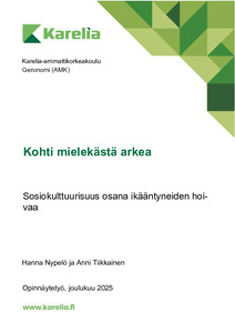 Opinnäytetyön tarkoituksena oli selvittää, kokeeko hoitohenkilöstö sosiokulttuurisen toiminnan osaksi hoitotyötä. Tavoitteena oli vahvistaa sosiokulttuurista työotetta sekä tehdä aktiivisen ja mielekkään arjen merkitystä näkyväksi gerontologisessa hoivatyössä. Opinnäytetyön kohderyhmänä toimi Kiuruveden Kallionsydämen hoitohenkilökunta. Opinnäytetyö toteutettiin toiminnallisena kehittämistyönä, jossa menetelminä käytettiin Webropol-kyselyä ja osallistavaa Learning Café -työpajaa. Kehittämistyön tuotoksena syntyi PowerPoint-opas, joka tukee toimeksiantajaa ja muuta henkilöstöä sosiokulttuuri sen toiminnan omaksumisessa osaksi hoitotyön arkea. Väestörakenteen muuttuessa ja iäkkäiden määrän kasvaessa korostuu gerontologisen hoito- ja hoivatyön merkitys. Sosiokulttuurinen toiminta tukee ikääntyneiden toimintakykyä, osallisuutta ja toimijuutta sekä edistää mielekästä arkea ja hyvää elämänlaatua ympärivuorokautisessa hoivassa.