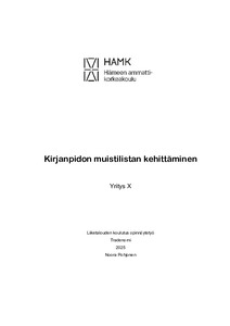 Opinnäytetyön lopputuloksena laadittiin selkeä ja rakenteeltaan uudistettu sähköinen muistilista, joka tukee kuukauden katkon prosessin sujuvuutta ja mahdollistaa tehtävien systemaattisen seurannan uudessa järjestelmässä. Toimeksiantaja ottaa uuden muistilistan käyttöön sähköisessä järjestelmässä marraskuussa 2025. Työ osoitti, että työtehtävien hallinnan selkeyttäminen ja yhtenäistäminen parantaa kuukauden katkon hallittavuutta, vähentää päällekkäistä työtä ja lisää työntekijöiden kokemaa varmuutta ja tehokkuutta. Lisäksi työ toi esiin, että parhaat kehitysratkaisut syntyvät, kun käytännön kokemukset ja kehittämistyö yhdistetään tiiviissä yhteistyössä yrityksen kanssa. The aim of this thesis was to develop the management of the assignment company's accounting for a month's closing and to create a clearer, more consistent and digitally suited checklist. The contractor for the work is a private company providing planning and consulting services. The work started when the company was implementing a new cloud-based system, which created the need to update and clarify the checklist of work tasks. The background was also influenced by practical observations that the current Excel-based checklist was perceived as confusing and accountants relied on their own personal checklists alongside it.