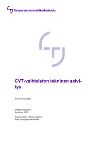Tämän Tampereen ammattikorkeakoululle (TAMK) tehdyn opinnäytetyön tarkoituksena oli laatia vaihteistojen tehtävästä autoissa kirjallinen selvitys ja perehtyä tarkemmin jatkuvan välityssuhteen vaihteistoon, niin sanottuun Continuously Variable Transmission (CVT)-vaihteistoon. Työssä käydään läpi CVT-vaihteiston historiaa ja sen matkaa toisten vaihteistotyyppien rinnalle varteenotettavana vaihtoehtona ajoneuvoratkaisuissa. Lukijaa tutustutetaan vaihteiston keskeisempiin komponentteihin ja toimintaperiaatteeseen yleisesti.