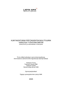 Opinnäytetyön aiheena oli kuntasektorin päätöksentekokulttuurin vaikutus työhyvinvointiin. Tarkoituksena oli selvittää, miten päätöksentekokäytännöt heijastuvat henkilöstön hyvinvointiin sekä tunnistaa kehittämistarpeita avoimuuden, läpinäkyvyyden ja osallisuuden vahvistamiseksi. Tavoitteena oli tuottaa kunnille käytännönläheisiä kehittämisehdotuksia, joiden avulla voidaan tukea työhyvinvointia ja johtamista.