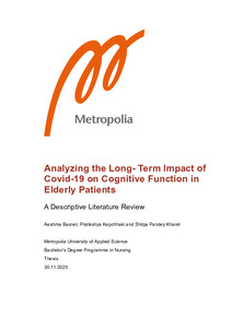 The thesis was carried out as a descriptive literature review, and the data was collected from the CINAHL and PubMed between 2020-2025. Inclusion and exclusion criteria were used for filtering or redefining the search. To increase knowledge of the covid 19 infection’s impacts on elderly people’s cognitive functions, 12 articles were selected based on our research questions. These selected articles were analysed using inductive content analysis to answer the two research questions.