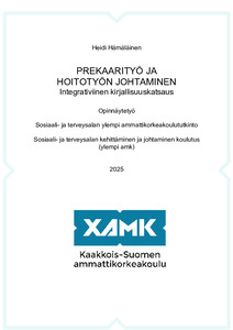 Sosiaali- ja terveysalalla prekaarityö on kasvava ongelma, jonka on osoitettu heikentävän hoitohenkilöstön veto- ja pitovoimaa. Ilmiötä ylläpitävät erityisesti epätyypilliset ja määräaikaiset työsuhteet, työelämän epävakaus sekä riittämättömät henkilöstöresurssit. Prekaarityötä pystytään ehkäisemään johtamisen keinoin, jota varten tarvitaan tutkittua tietoa esihenkilötyön ja päätöksenteon tueksi. Opinnäytetyön tarkoituksena oli tuottaa tietoa prekaarityötä lisäävistä ja vähentävistä tekijöistä sekä esittää kehittämisehdotuksia johtamisen keinoista, joilla voidaan ehkäistä prekaarityötä sosiaali- ja terveysalalla. Tutkimuskysymysten avulla selvitettiin, mitkä tekijät lisäävät tai vähentävät prekaarityötä hoitoalalla ja millä tavoin sitä voidaan ehkäistä johtamisen keinoin. Opinnäytetyö toteutettiin integratiivisena kirjallisuuskatsauksena. Aineisto haettiin useista kansainvälisistä ja kotimaisista tietokannoista (PubMed, Sage Journals/Sage Premier, CINAHL, Opetus- ja kulttuuriministeriön artikkelikokoelmat, FINNA ja Springer Company) ennalta määriteltyjen sisäänotto- ja poissulkukriteerien mukaisesti. Tietokonnaista saatiin yhteensä 537 hakutulosta. Seulonnan jälkeen katsaukseen valikoitui lopullisesti 20 vertaisarvioitua artikkelia. Katsaukseen sisältyi sekä suomalaisia että kansainvälisiä tutkimuksia, jotka oli julkaistu vuosina 2018–2025. Kirjallisuuskatsauksen tulosten pohjalta muodostettiin kehittämisehdotukset prekaarityön ehkäisemiseksi sosiaali- ja terveysalalla. Kehittämisehdotukset painottuvat johtamisosaamisen vahvistamiseen, riittävien resurssien turvaamiseen, työelämän vakauden lisäämiseen sekä henkilöstön hyvinvoinnin tukeminen. Opinnäytetyön tuottamaa tietoa voidaan hyödyntää sosiaali- ja terveysalan organisaatioiden toiminnan ja työhyvinvoinnin edistämisessä. Asiasanat: prekaarityö, sosiaali- ja terveysala, johtaminen, työhyvinvointi, esihenkilötyö Precarious work was identified as a growing problem in the social and health care sector, weakening the attractiveness of the profession and the retention of care personnel. The phenomenon was reinforced by atypical fixed-term employment contracts, instability in working life, and insufficient human resources. The objective of the thesis was to examine factors that increased or decreased precarious work and to propose management methods that could prevent precarious work in the sector. The thesis was conducted as an integrative literature review. The data was retrieved from several international and domestic databases (PubMed, Sage Journals/Sage Premier, CINAHL, the Ministry of Education and Culture’s article collections, FINNA, and Springer Company) according to predefined inclusion and exclusion criteria. Database searches produced a total of 537 search results. After the screening process, a total of 20 peer-reviewed articles were included in the review. The final selection involved both Finnish and international studies published between 2018 and 2025. The results of the review showed that precarious work could be reduced by strengthening management skills, ensuring sufficient resources, and increasing stability in working life. Supporting the workplace well-being of personnel was also found to be an essential factor. The findings provided practical development proposals for management and produced information that can be utilized by organizations in the social and health care sector to improve both personnel retention and workplace well-being. Keywords: precarious work, social and health care sector, management, workplace well-being, supervisory work