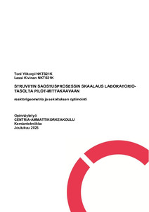 Työn tavoitteena oli skaalata laboratoriossa toimivaksi todettu struviitin saostusprosessi te-ollisempaan mittakaavaan ja tuottaa struviittia ravinteiden talteenottoon. Tavoitteena oli tunnistaa reaktorigeometrian, sekoituksen ja erotusvaiheen keskeiset tekijät, jotka varmista-vat prosessin operoinnin ja tuotteiden muodostamisen mittakaavan kasvaessa. Menetelmä yhdisti kirjallisuuskatsauksen ja vaiheittaisen kokeellisen pilotoinnin pienestä sekoitusjär-jestelmästä koetehtaan reaktoriin, jolloin arvioitiin virtausdynamiikkaa, pH-ohjausta ja sopi-via erotusratkaisuja.