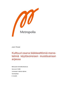 Tämän opinnäytetyön tavoitteena oli selvittää, millaisia lääkkeettömiä menetelmiä voidaan hyödyntää muistisairaan hoidossa ja miten kulttuuri toimii osana näitä menetelmiä. Opinnäytetyö toteutettiin kuvailevana kirjallisuuskatsauksena, ja aineisto koostui tieteellisistä artikkeleista, viranomaislähteistä ja asiantuntija-kirjallisuudesta. Aineisto analysoitiin aineistolähtöisen sisällönanalyysin avulla, jonka avulla muodostettiin keskeiset teemat, yläluokat ja alaluokat.