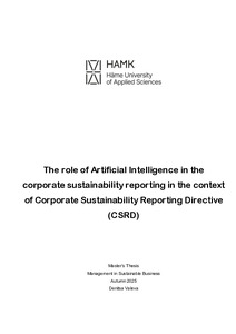 This thesis examines the challenges and opportunities for Artificial Intelligence (AI) in sustainability reporting in accordance with the Corporate Sustainability Reporting Directive (CSRD). The first step in the literature review was to outline the key applications of AI related to sustainability reporting and then assess the regulatory and ethical aspects of its implementation in organisations. Next, global initiatives such as the UN 2030 Agenda and the Paris Agreement were examined to provide context for the European Union’s policy framework in the field of climate governance. The background material also covers EU sustainability policies such as Taxonomy, the Corporate Sustainability Disclosure Directive (CSDDD), but the focus is specifically on the CSRD.