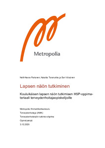 Tämän opinnäytetyön tarkoituksena oli tuottaa oppimateriaali Kouluikäisen lapsen näön tutkimisesta. Opinnäytetyömme tehtiin osaksi Metropolian terveydenhoitotyön tutkinnon opiskelumateriaaleja.