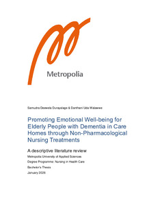 This literature review focused on the enhancement of emotional well-being for elderly people with dementia in care homes. The purpose of this literature review was to describe non-pharmacological nursing used to promote the emotional well-being of elderly people with dementia. The aim was to generate new knowledge about nursing treatment that promotes the emotional well-being of elderly people with dementia in care homes, and the challenges associated with it.